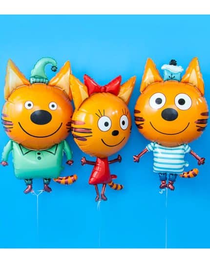 Большие воздушные шары в стиле «Три кота» могут быть выполнены в различных формах, включая шары в форме головы каждого кота, а также шары с их изображениями. Эти шары могут быть оформлены в различных цветах, чтобы соответствовать теме вечеринки.
